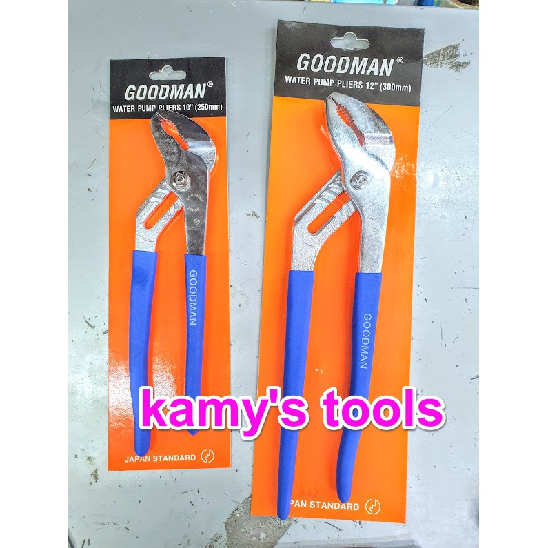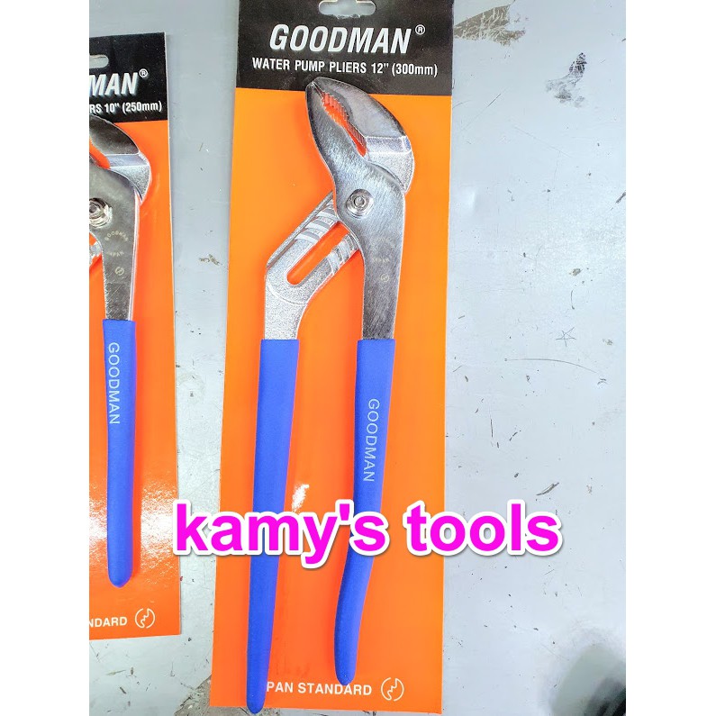 Kamy’s tools chuyên phân phối các loại kìm mỏ quạ, kìm 5 lỗ, kìm bờ rô, là một trong những dụng cụ cầm tay chuyên dùng để tháo mở các co ống nước, đai ốc bu lông con tán lớn nhỏ khác nhau. Kìm mỏ quạ được sử dụng nhiều trong nhu cầu sửa chữa các đường ống nước, các anh thợ sửa chữa ống nước với thao tác nhanh chóng có thể điều chỉnh được độ mở miệng lớn nhỏ tùy theo lớn nhỏ của các ống nước. Trong đó có kìm mỏ quạ goodman 10 inch 250mm 12 inch 350mm chính hãng hay còn được gọi là kìm mỏ quạ goodman 10 inch, kìm mỏ quạ goodman 250mm, kìm mỏ quạ goodman 300mm, là 2 kìm mỏ quạ có chiều dài khác nhau lần lượt là 250mm và 300mm với thương hiệu goodman nổi tiếng sản xuất các dụng cụ cầm tay có chất lượng tốt. kìm mỏ quạ goodman 10 inch 250mm 12 inch 350mm chính hãng được chế tạo với chất lượng thép chrome vanadium cho độ cứng của thép cao với cán tay cầm được bọc nhựa có lớp sần sùi giúp cho ta cầm nắm chắc chắn vặn tháo mở một cách nhanh chóng. Kìm mỏ quạ goodman 10 inch 250mm 12 inch 350mm chính hãng đều được thiết kế dạng trượt để điều chỉnh độ tháo mở lớn nhỏ của miệng kìm. Hãy liên hệ với kamy’s tools để biết thêm thông tin chi tiết sản phẩm kìm mỏ quạ goodman 10 inch 250mm 12 inch 350mm chính hãng.kìm mỏ quạ goodman 10 inch 250mm 12 inch 350mm chính hãng có khắc lo go goodman trên thân kìm.
