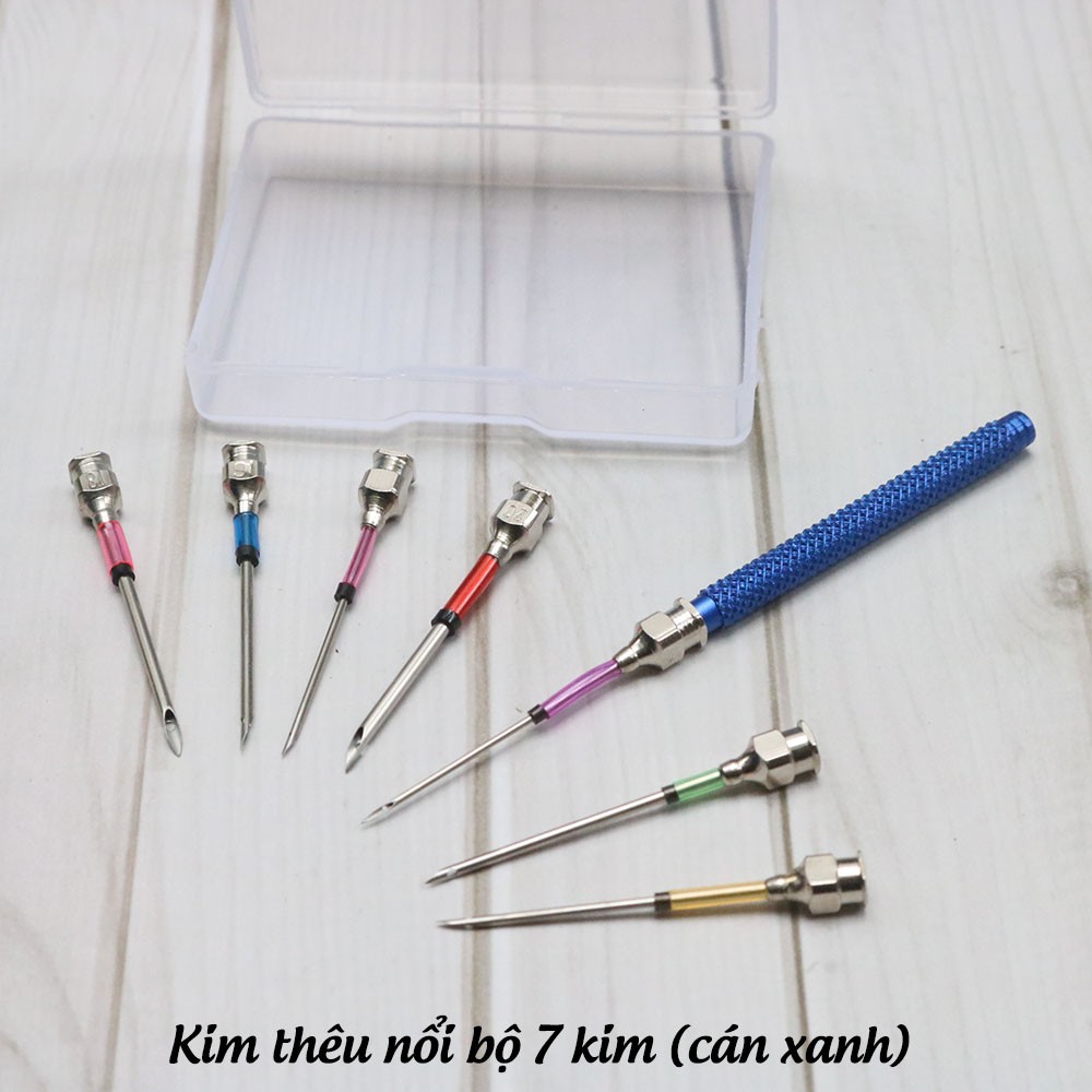 - 7 kim thêu nổi dài 4.5cm, kích thước từ nhỏ đến lớn được đánh số thứ tự 9, 10, 12, 14, 16, 18, 20 tương ứng để xỏ 1 sợi chỉ, 2, 3, 4, 5, 6 và 8 sợi chỉ.