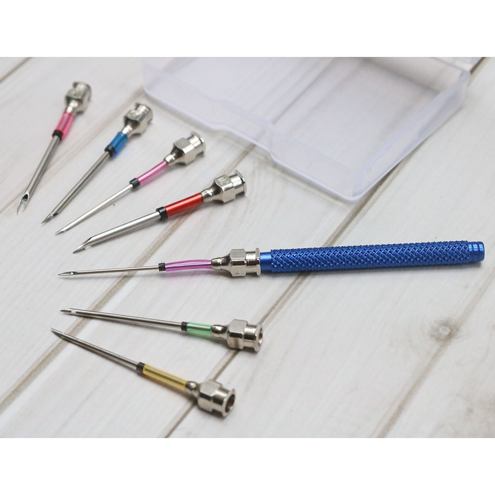 - 1 dụng cụ xỏ kim (bộ cán màu xanh không có dụng cụ xỏ đi kèm, có thể sử dụng dây thép mỏng để xỏ chỉ)