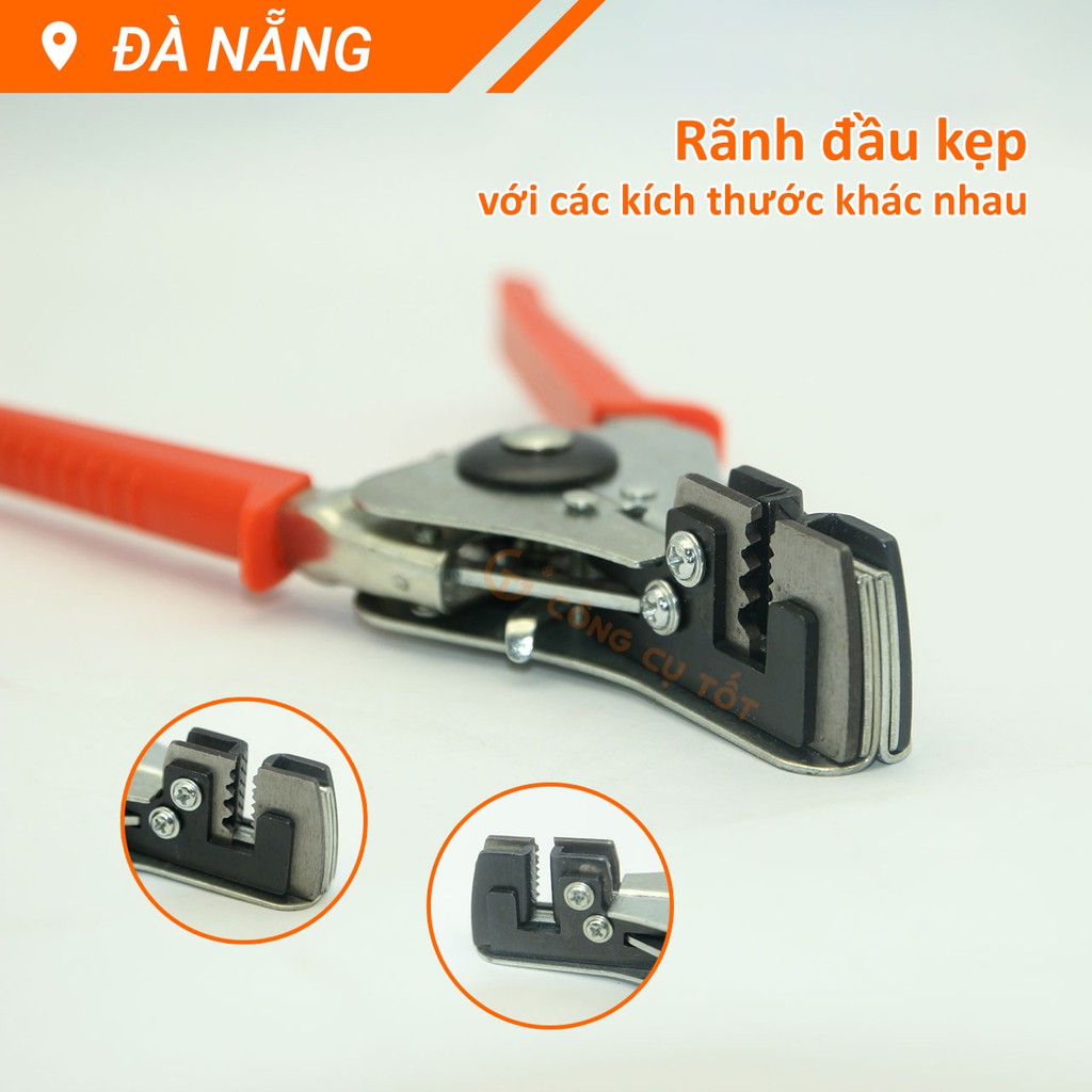 Chất liệu: Thép không gỉ có độ bền cao.Đầu kẹp có nhiều rãnh, có thể tuốt được nhiều loại dây điện kích thước khác nhau (0.5-2.2mm).