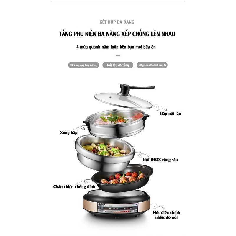 Ngoài ra, nồi lẩu điện còn thiết kế vỉ bằng inox 304 dùng để hấp thức ăn, sử dụng để chiên xào,…tiện dụng