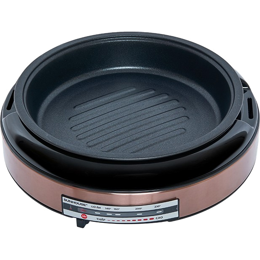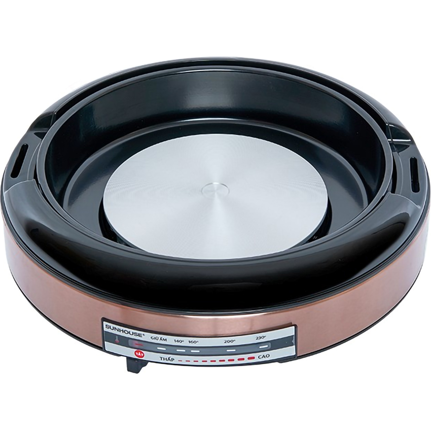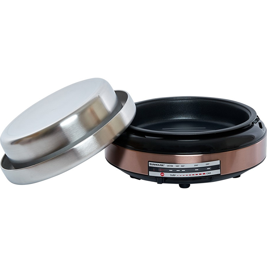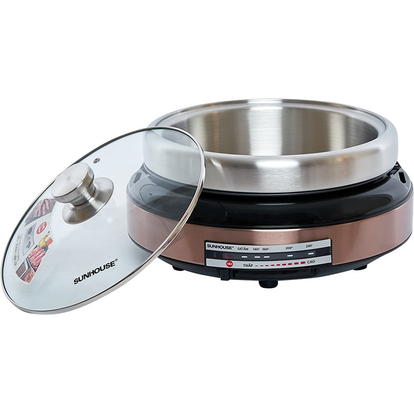 Nồi lẩu điện Sunhouse nấu nướng đa dạng các món ăn với 2 chức năng lẩu, nướng Công suất 1300W nấu chín thức ăn nhanh, tiết kiệm thời gian Màu đồng sang trọng tinh tế, không bám bẩn, dễ vệ sinh Thân nồi làm từ thép sơn tĩnh điện, chịu lực, chịu nhiệt tốt Nồi điện đa năng dung tích 4 lít, phù hợp sử dụng cho từ 4 - 6 người Nắp kính thủy tinh trong suốt, có thể quan sát khi nấu
