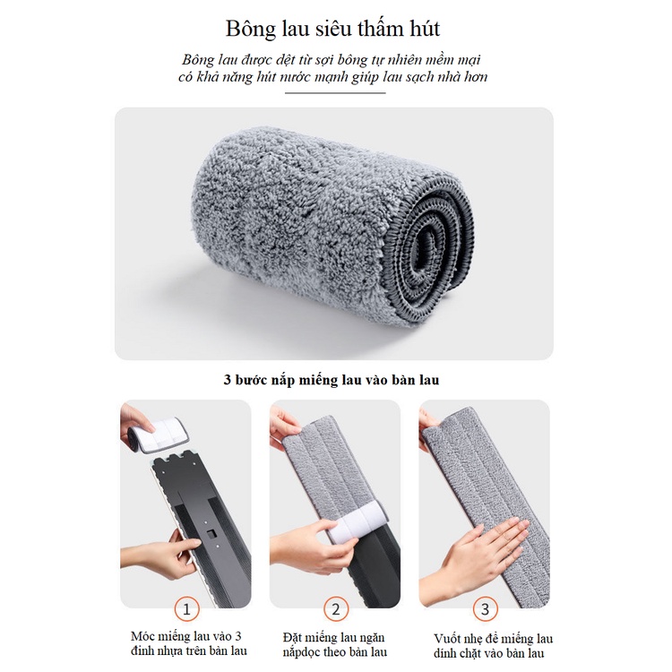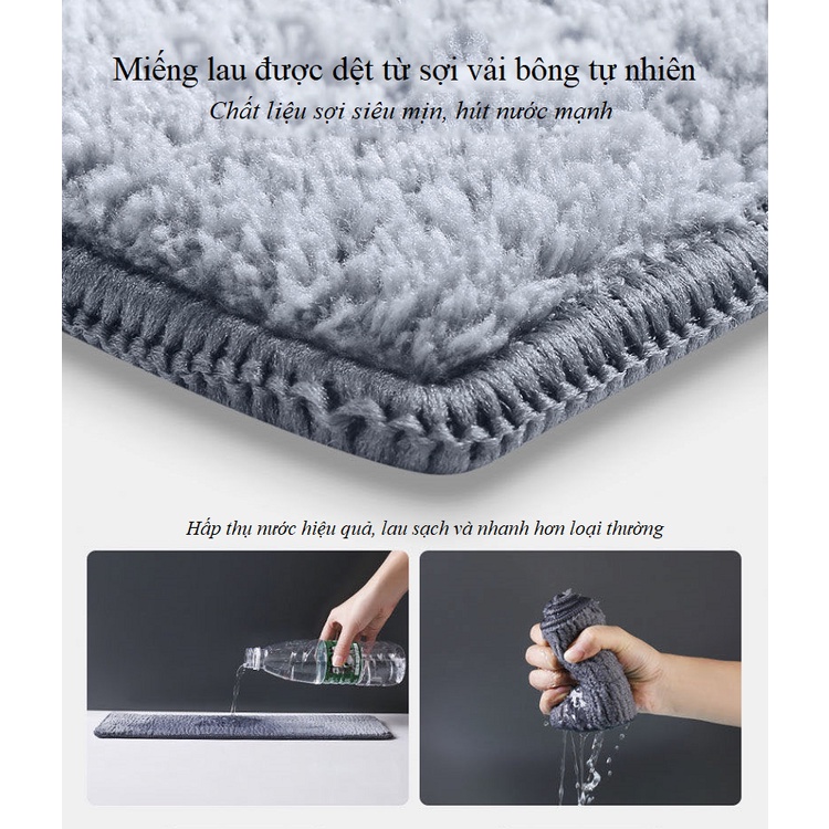 ✔️ Miếng bông lau của cây lau nhà được làm bằng sợi vải bông mềm mại với các đường chỉ may chắc chắn, độ thấm hút rất tốt, giúp lau sạch nhà hơn.