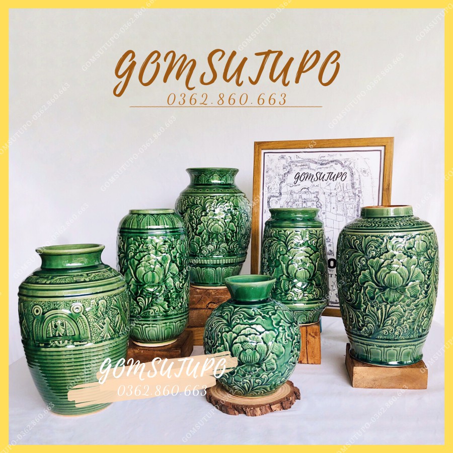 Lọ Hoa ❤️FREESHIP❤️Bình hoa Vân Nổi - gomsutupo - Men Xanh Ngọc Lục Bảo - Gốm Sứ TUPO - Gốm Sứ Bát Tràng