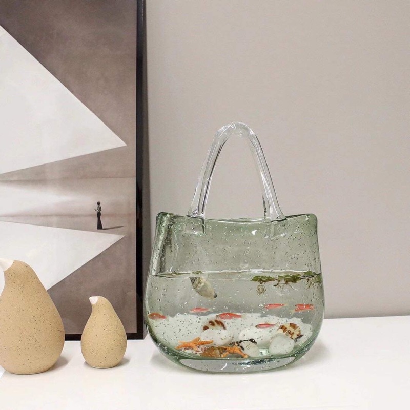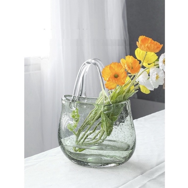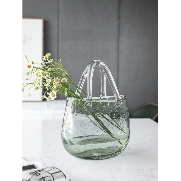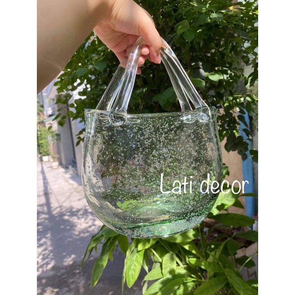 LỌ HOA THỦY TINH XANH HÌNH GIỎ XÁCH ĐỘC ĐÁO, THỦY TINH CÓ BỌT NƯỚC LẠ MẮTCHẤT LIỆU