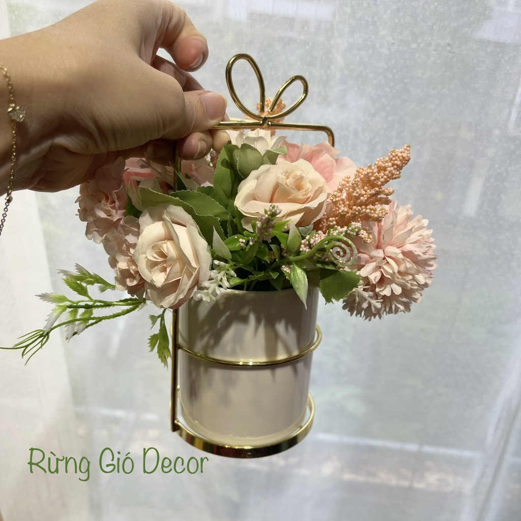 Mã 135: lọ sứ trắng viền kim loại + hoa màu hồng , cao 27cm tính từ đáy lọ đến viền đầu đỉnh nơ kim loại, giá 180k