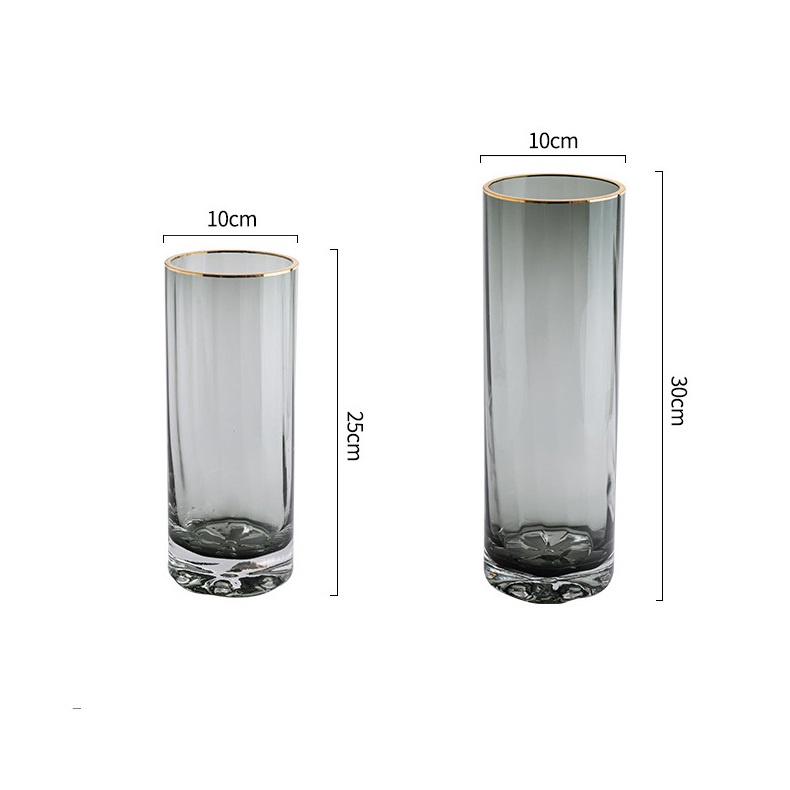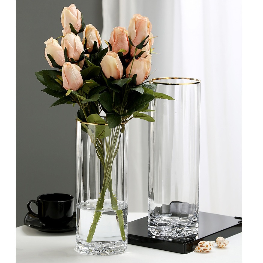 Lọ hoa thuỷ tinh bình hoa cao cấp trang trí nhà cửa kiểu dáng hình trụ viền miệng vàng - Daisy.decor - Hàng có sẵn