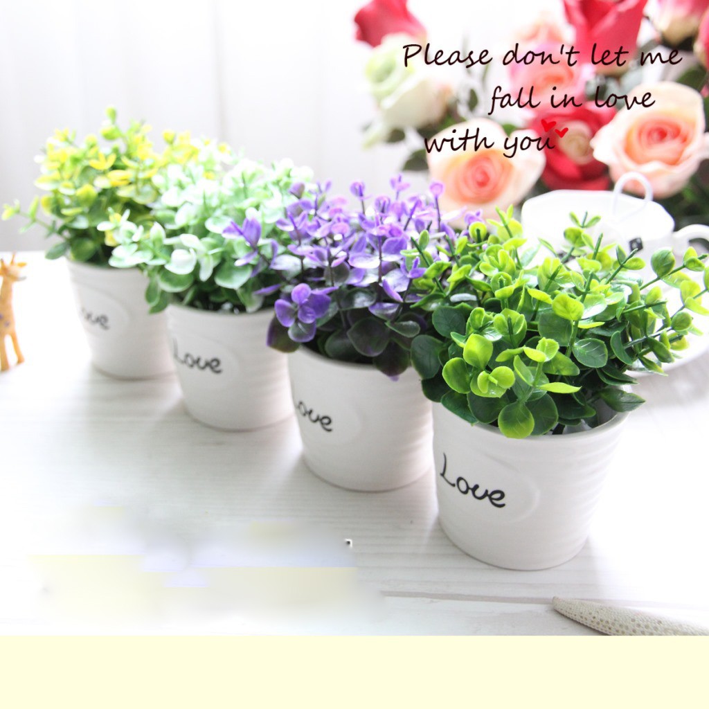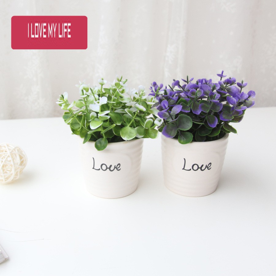 Lọ Hoa trang trí để bàn, hoa bonsai giả chậu sứ chữ LOVE - H0129 (nhiều màu lựa chọn)