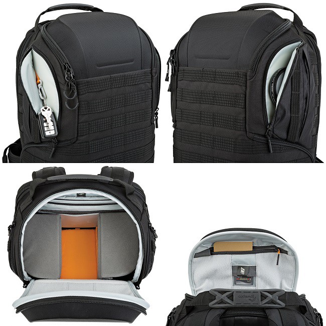 có thiết kế đặc trưng của dòng ba lô Lowepro ProTactic với 4 hướng mở vào: từ mặt trên, từ hai bên hông và từ phía sau. Phía sau balo có quai trợ lực có thể tháo rời và gắn kèm được với phụ kiện đi kèm khác. Thiết kế ngăn đựng áo mưa kết hợp ở đáy balo giúp tiết kiệm không gian cho các thiết bị chính cũng như dễ dàng lấy ra hay cất vào trong lúc di chuyển.kèm theo với bộ phụ kiện gồm bộ dây gắn chân máy vào balo, túi đựng bình nước, túi nhỏ đựng phụ kiện, và áo mưa.