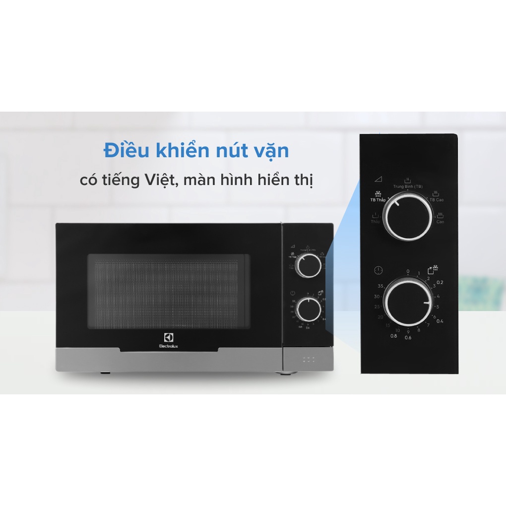Lò vi sóng Electrolux cơ bản sử dụng nấu, hâm nóng, rã đông, với 5 mức công suất tùy chỉnh bằng núm xoay đơn giản, tiện lợi, dễ dùng cho mọi người