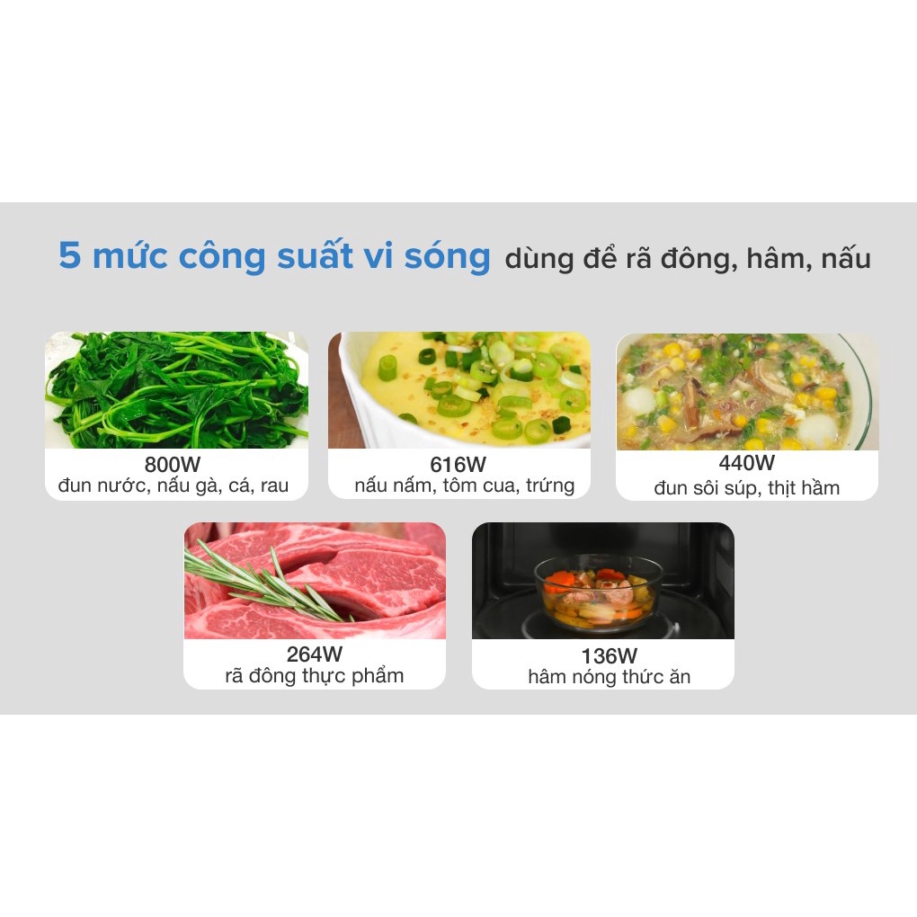 Đa chức năng: nấu, hâm nóng, rã đông với công suất tối đa 800 W. Chế độ rã đông theo thời gian giúp bảo toàn độ tươi ngon và dinh dưỡng của thực phẩm.