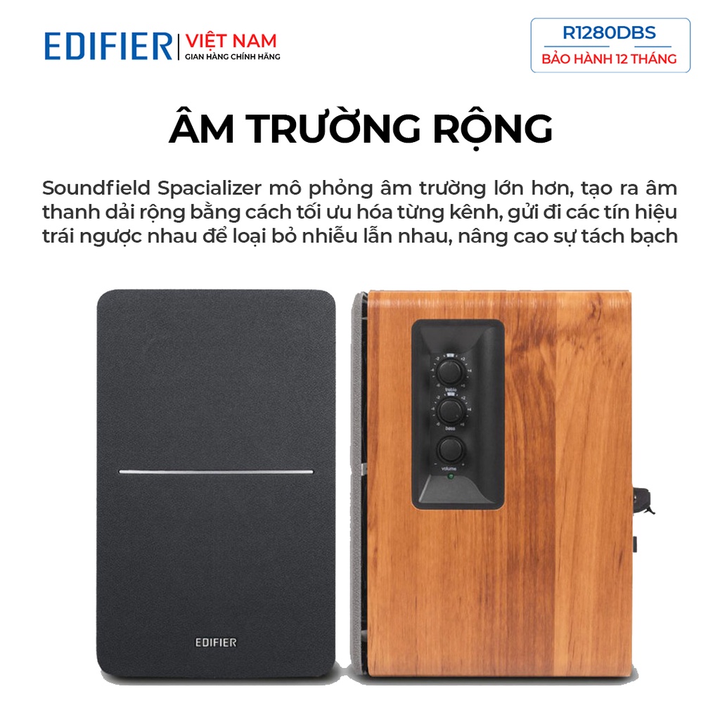 - Tính năng “mở rộng không gian” hay ho chỉ có trên những model mới thuộc R series của Edifier, trải nghiệm Sound Field trên loa Edifier R1280DBs cho bạn cảm thấy không gian âm thanh rộng hơn, nghe thoải mái hơn.