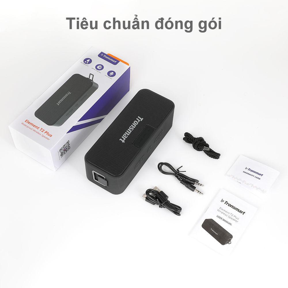 Đóng gói: 1 x loa không dây Element T2 Plus, 1 x cáp sạc USB, 1 x cáp âm thanh 3,5 mm, 1 x Dây buộc, 1 x Thẻ bảo hành, 1 x Hướng dẫn sử dụng