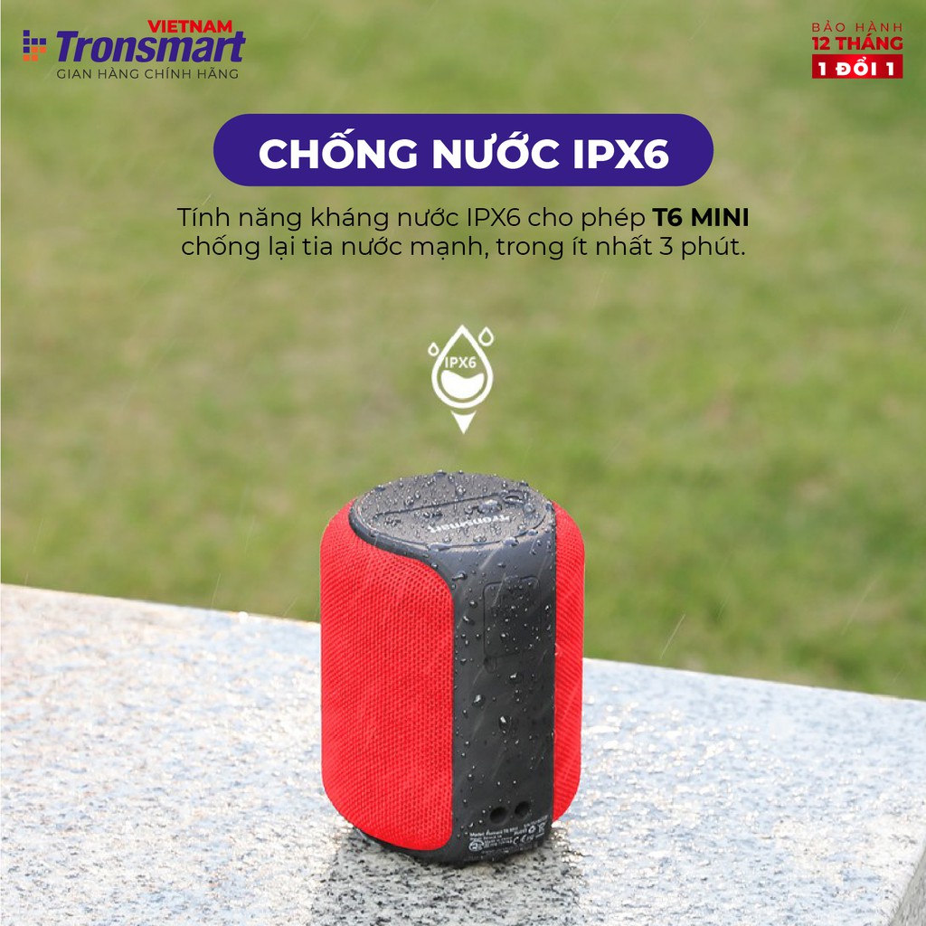 - Tính năng kháng nước IPX6: Xuống hồ bơi hay ngoài bãi biển, T6 Mini cùng chuẩn kháng nước và bụi IPX6 cho bạn sự bảo vệ toàn diện để mang loa tới mọi nơi.