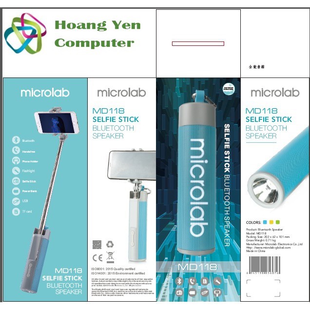 Loa Bluetooth Đa Năng Microlab MD118 Kiêm Gậy Tự Sướng, Đèn Pin, Pin Dự Phòng - BH 12 Tháng Chính HãngBảo hành 1 năm bằng tem tại shop. 1 đổi 1 trong 2 tuần đầu nếu lỗi kĩ thuật và sản phẩm còn mới không trầy, xước (Quý khách vui lòng giữ lại hộp và phụ kiện). Hổ trợ phí ship 2 chiều trong 15 ngày đầu nếu sản phẩm lỗi. Sản phẩm cần mở hộp để dán tem bảo hành.