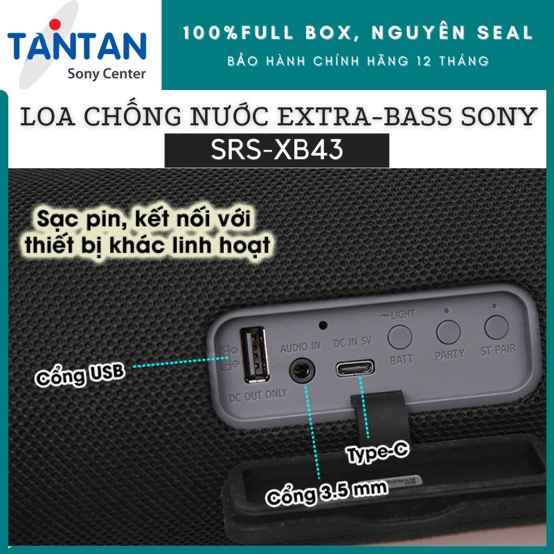 Thiết Bị Âm Thanh > Dàn âm thanh > Loa || Loa BLUETOOTH EXTRA-BASS Sony SRS-XB43 | 2 Loa Tweeter - Live Sound - Party Chain - Pin: 24h - Type C - Chống nước, bụiCòn hàng