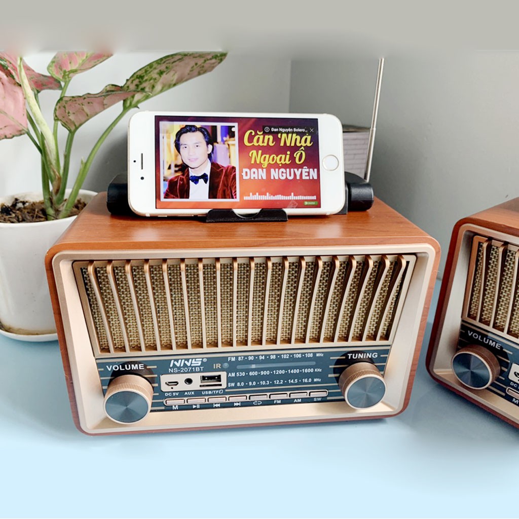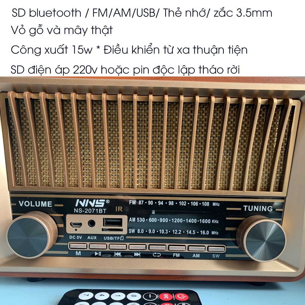 Loa bluetooth gỗ có điều khiển từ xa NS 2071 thiết kế dáng cổ điển trên chất liệu gỗ thật và mây. công xuất 15w tích hợp sử dụng nguồn đầu vào điện áp 220V hoặc pin 1200w cho thời lượng sd liên tục lên 4-6h. Kết nối đa phương tiện bluetooth, zắc âm thanh 3.5, thẻ nhớ, usb ... sử dụng được trên nhiều nền tảng điện thoại, tivi, laptop,... Ngoài chức năng nghe nhạc chính còn sử dụng nghe đài FM/ AM. Cho chất lượng âm thanh độ trong tuyệt hảo, Loa có điều khiển từ xa vô cùng thuận tiện hoặc điều khiển cơ học qua núm trên thân loa đều rất dễ dàng==========================