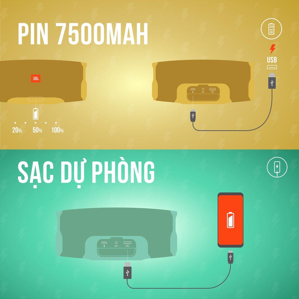JBL Charge 4 còn được trang bị lõi pin Lithium-ion polymer với dung lượng cao lên đến 7.500 mAh, giúp người dùng thoải mái cùng bạn bè chơi đùa lên tới 20 tiếng và chỉ cần 5,5 tiếng sạc là đầy pin. Ngoài ra, người dùng cũng dễ dàng theo dõi dung lượng pin còn lại để kiểm soát không bị hết pin giữa chừng thông qua một đèn LED thông minh.