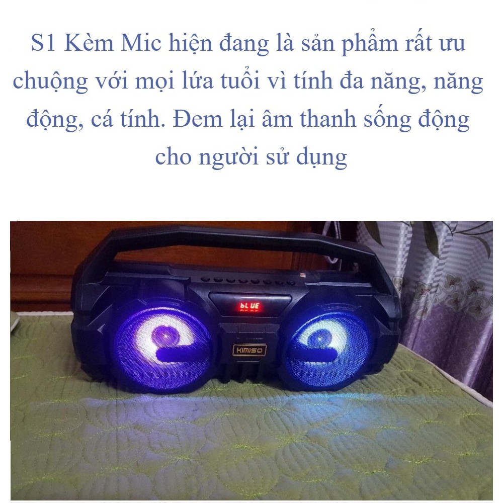 Loa bluetooth karaoke Kimiso S1 Kèm Mic hiện đang là sản phẩm rất ưu chuộng với mọi lứa tuổi vì tính đa năng, năng động, cá tính. Đem lại âm thanh sống động cho người sử dụng