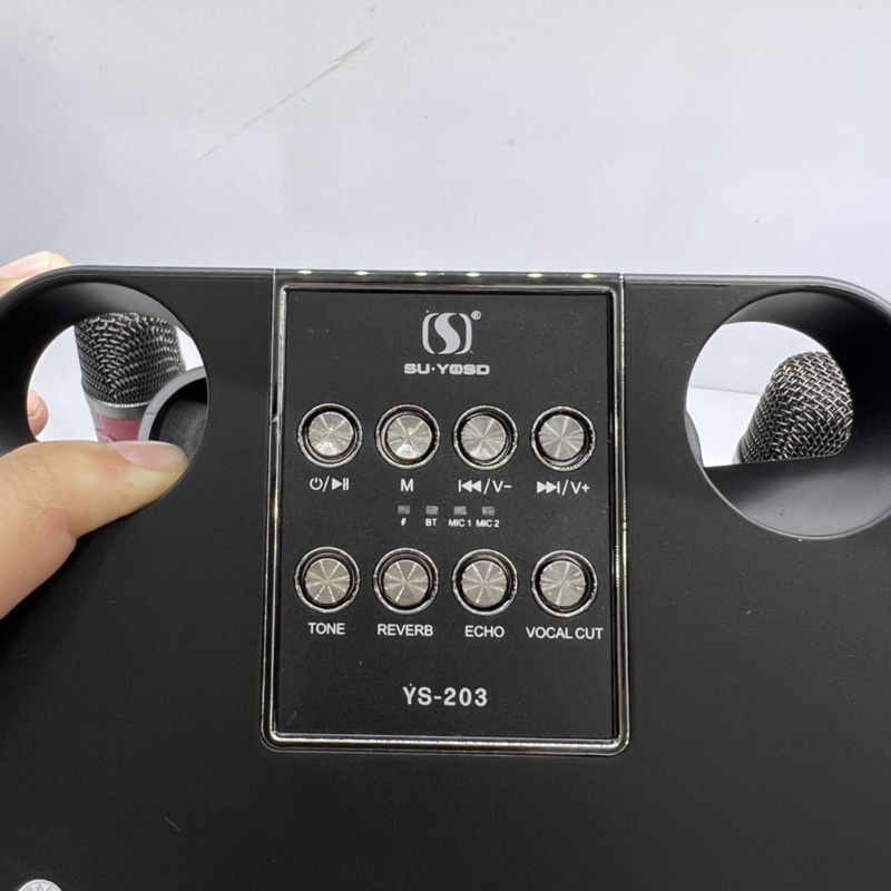 Loa karaoke YS-203 – Tặng kèm 2 micro không dây – Hiệu ứng đổi giọng, điều chỉnh echo, reverb, effect – Hiệu ứng đổi tông giọng vui nhộn – Là dòng loa xách tay du lịch thời trang nghe nhạc, hát karaoke cực hay – Thiết kế hiện đại, gọn gàng và sang trọng.Bên cạnh đó là 2 điểm đặt micro được thiết kế ngay trên loa giúp bạn có chỗ đặt khi không cần dùng, không phải để bên ngoài dễ gây thất lạc hay rơi vỡ micro.