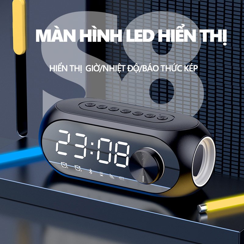 Loa bluetooth không dây mini S8, đồng hồ để bàn decor báo thức làm đèn ngủ đo nhiệt độ phòng