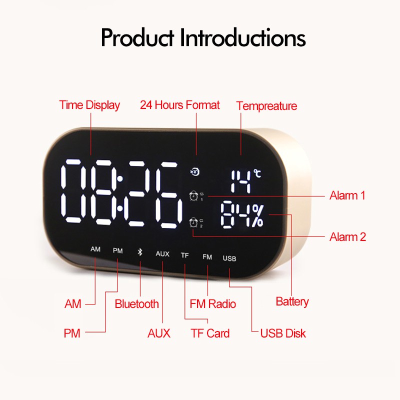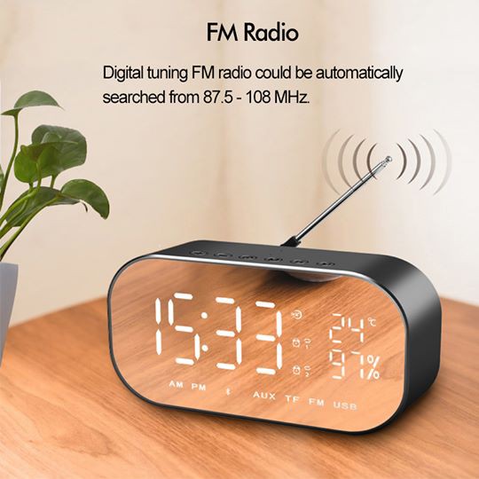 Loa bluetooth nghe đài FM kiêm đồng hồ báo thức Yayusi S21. Màn hình LED hiển thị lớn: LED hiển thị đồng hồ định dạng 12H và 24H, báo thức, trạng thái chế độ, mức PIN và nhiệt độ theo độ C và độ F (°C/°F). Bạn cũng có thể sử dụng nó như một chiếc gương soi. Và có thể điều chỉnh độ sáng 3 mức độ (BRIGHTEST, MIDDLE & LOWEST).