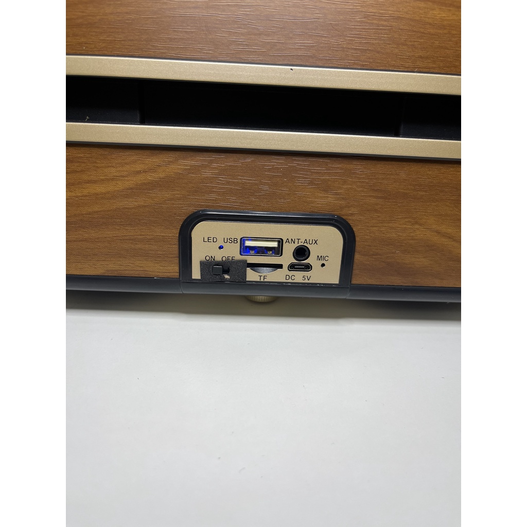👉 Loa hình chữ nhật với mặt trước là hệ thống loa và các phím điều kiển, nút tăng giảm âm lượng mặt trên cổng cắm thẻ nhớ, cổng USB, cổng AUX(cổng Jack 3.5mm), cổng sạc 5V, phím bặt tắt nguồn và khay giá đỡ điện thoại.