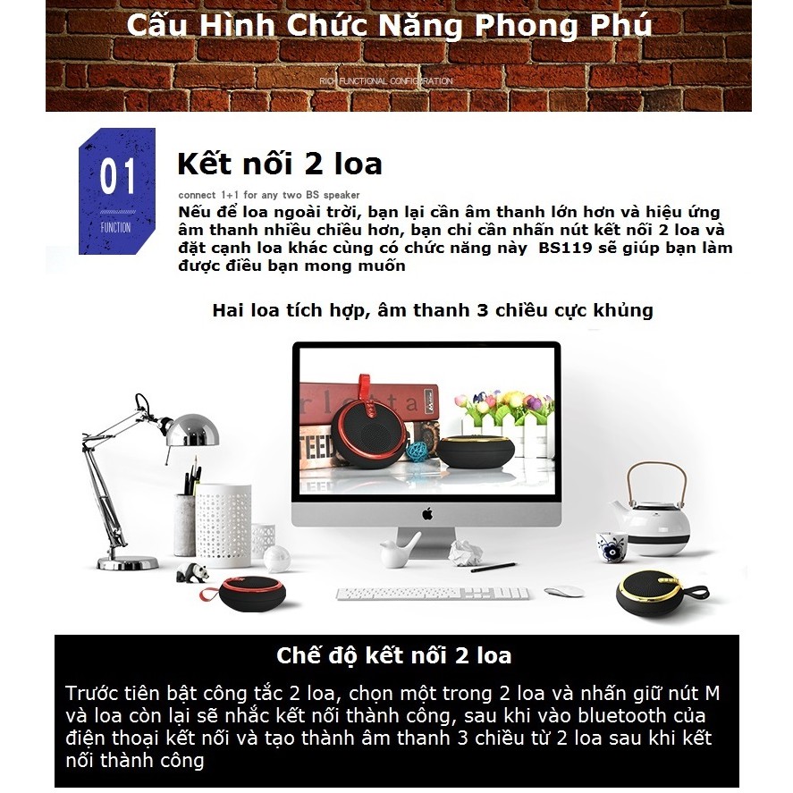 - Về mặt âm thanh, loa bluetooth BS119 có khả năng tái tạo âm bass chắc và ổn định, mang tới cho người dùng những trải nghiệm âm nhạc rất tốt