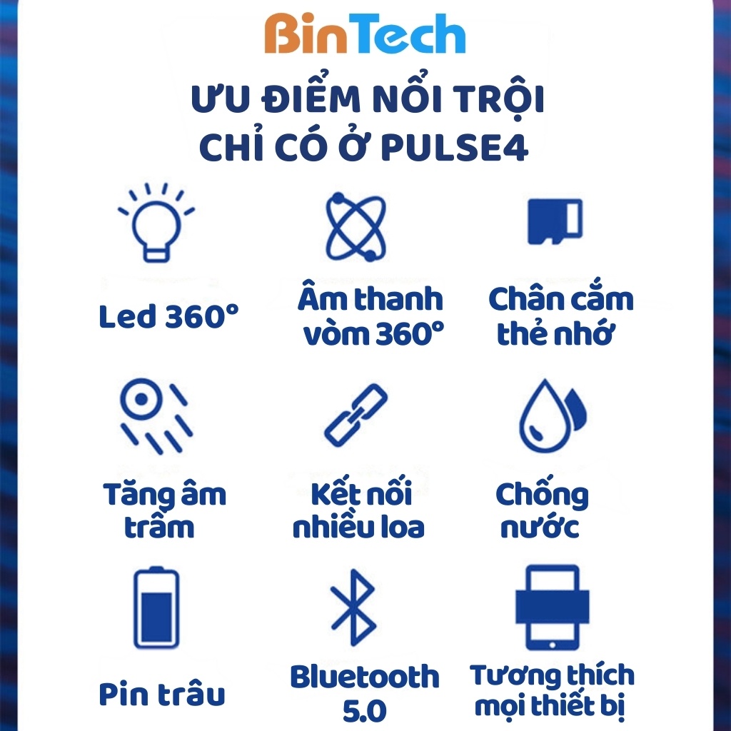 Giới thiệu Loa bluetooth mini Pulse 4 BINTECH âm bass căng có dải led đổi màu pin phủng, chống nước