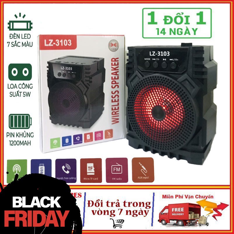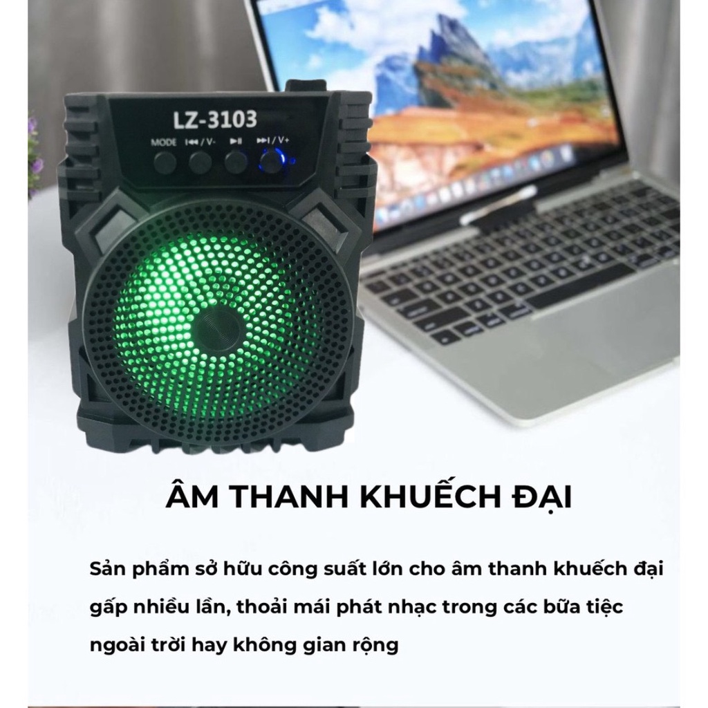 Loa nghe nhạc bluetooth Lz-3103 Loa bluetooth min đèn LED nhấp nháy âm thanh siêu hay hỗ trợ cắm thẻ nhớ- Loa nghe nhạc bluetooth Lz-3103 trang bị công nghệ bluetooth vô cùng phổ biến nên bạn có thể kết nối loa với các thiết bị công nghệ thông minh như điện thoại, máy tính bảng, laptop đấy nhé. Sử dụng bluetooth ở loa cũng rất đơn giản, chỉ cần mở nguồn là loa sẽ tự động mở kết nối , sau đó kết nối của điện thoại bạn với loa là có thể nghe nhạc, xem phim, gọi điện trò chuyện thông qua loa cực kì thoải mái thoải mái.