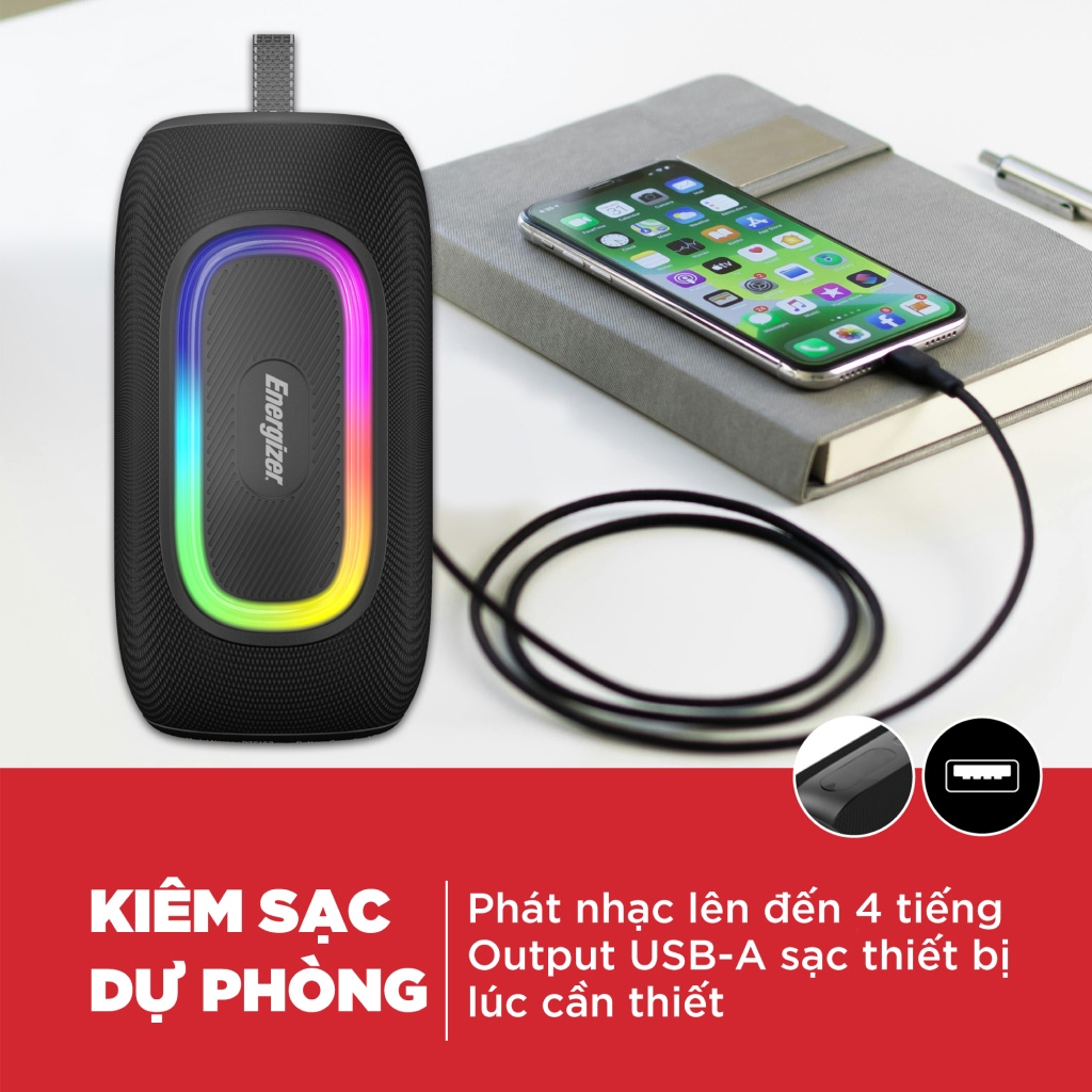 Tích hợp pin dự phòng, hỗ trợ sạc khẩn cấp cho thiết bị lúc cần. Hỗ trợ TWS đồng bộ được 2 loa với nhau thông qua Bluetooth Đa dạng kết nối với bluetooth 5.2, thẻ Micro SD, USB và AUX. Dây đeo tiện lợi, giúp bạn dễ dàng mang theo mọi lúc mọi nơi. Hệ thống đèn RGB rực rỡ, tăng thêm trải nghiệm giải trí âm thanh. Chất lượng âm thanh cao cấp với loa kép 8W Khoảng cách kết nối bluetooth lên đến 10m. Trang bị tính năng kháng nước chuẩn IPX65. Hỗ trợ chức năng Rảnh tay, thẻ Micro SD, USB, AUX.