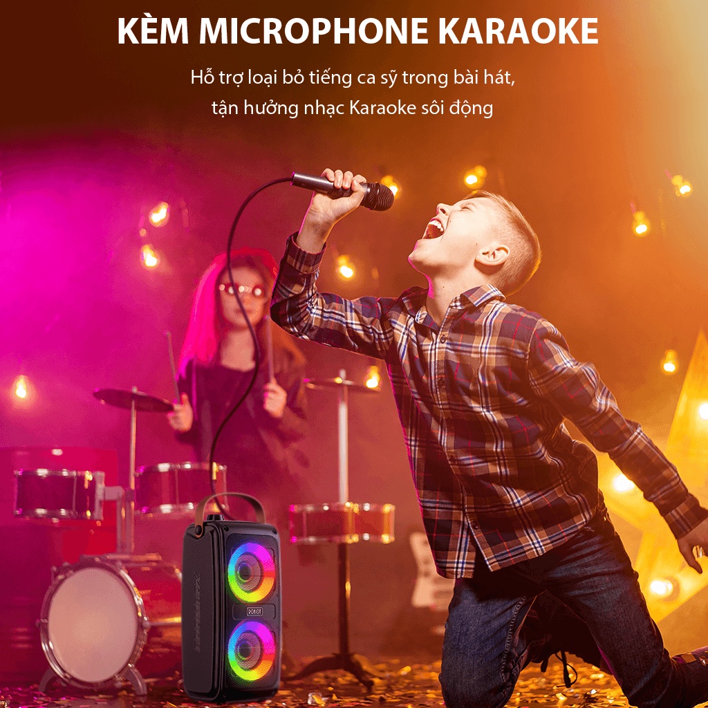 - Loa đi kèm Micro Karaoke, hỗ trợ loại bỏ tiếng ca sĩ trong bài hát, tận hưởng các bài hát karaoke sôi động.
