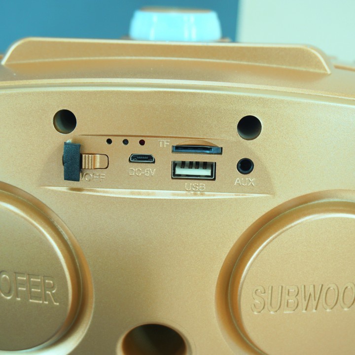 - Điểm nổi bật của chiếc loa bluetooth SD-306 này là các nút điều chỉnh cảm ứng phía trên thân loa, ở giữa là volume tổng để điều chỉnh âm lượng bằng cách vặn xoay dễ dàng, tiện lợi
