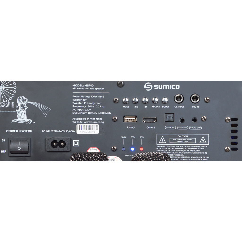 Loa Sumico có tay cầm phía trên giúp di chuyển dễ dàng Tổng công suất thực tế 100W RMS với 2 kênh âm thanh nổi Trang bị củ loa Bass 25,4cm cho âm trầm mượt mà, chắc chắn Ngõ vào đa dạng: Bluetooth 5.0, optical, HDMI, USB, SD card Các nút điều chỉnh loa được bố trí phía trên tiện lợi khi sử dụng Loa đi kèm 2 micro không dây chất lượng cao để hát karaoke Thời lượng pin có thể lên đến 8 tiếng (cho mức 50% âm lượng)