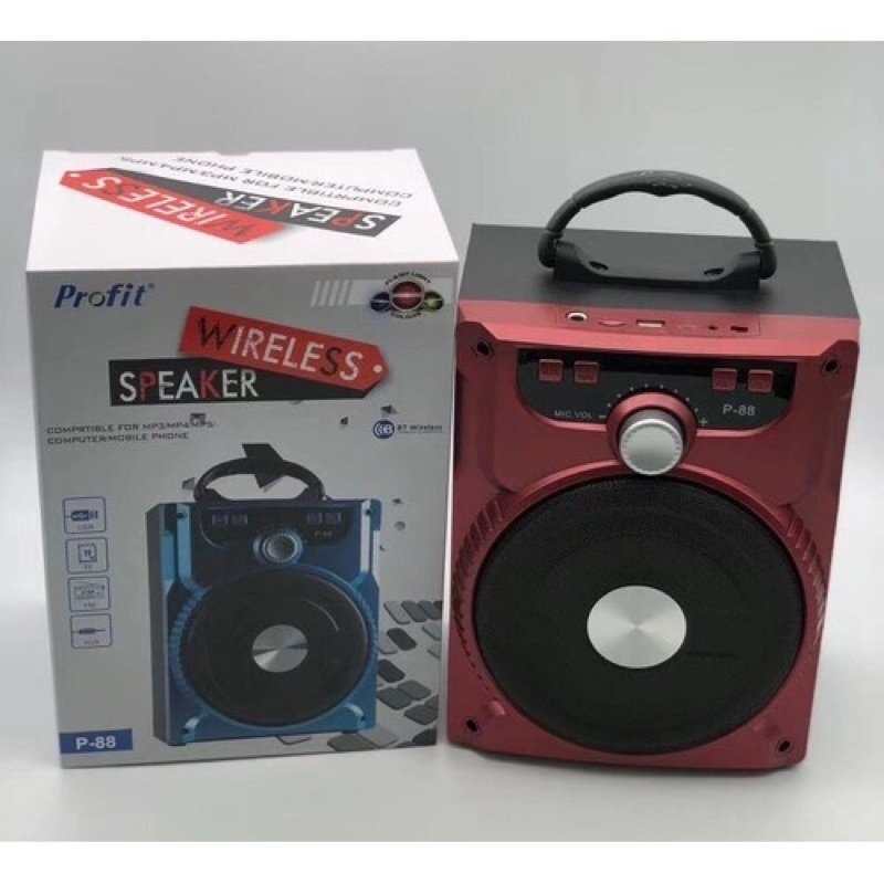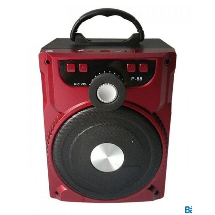 Loa bluetooth, karaoke P88, tuy có thiết kế bên ngoài khác biệt nhưng tính năng của loa P88 cũng tương tự như mẫu P89, cũng vẫn hỗ trợ nghe nhạc qua kết nối không dây với các thiết bị, ngoài ra loa còn tích hợp thêm 2 cổng nghe nhạc từ USB và thẻ nhớ, P-88 còn có thêm cổng cắm mic có dây: chúng ta có thể dùng chức năng này cho việc đáp ứng các nhu cầu: đào tạo, bán hàng, quảng bá, hướng dẫn, ca hát giải trí ...