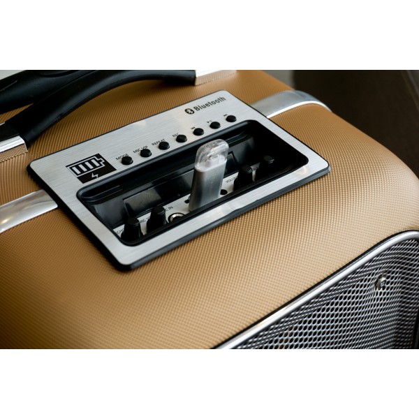 Chiếc SoundMax M6 có thiết kế dạng vali kéo màu da bò với điểm nhấn là lưới nhôm bạc phía trước nhìn khá sang trọng, so với các dòng loa kéo hiện tại trên thị trường.
