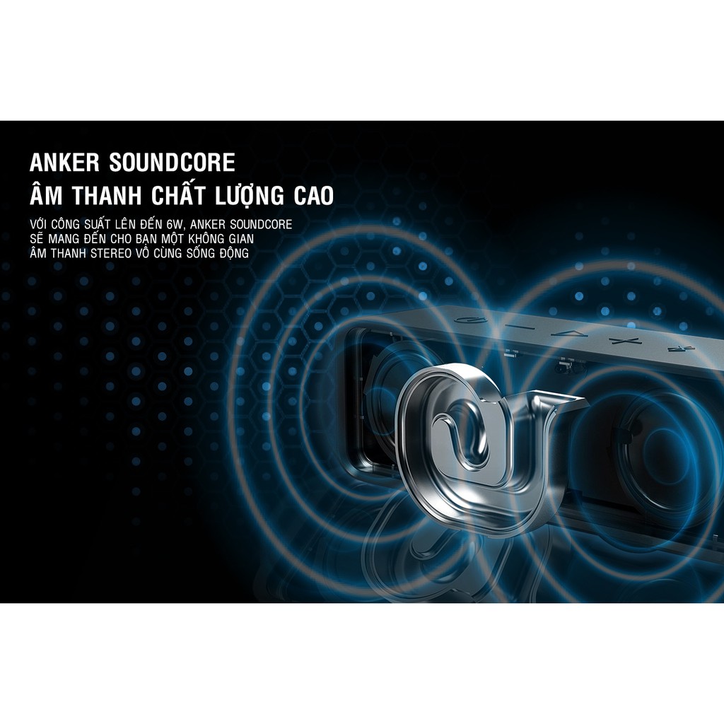Âm thanh chất lượng caoVới công suất lên đến 6W (2 loa mỗi loa 3W), loa di động Anker SoundCore sẽ đem đến cho bạn một không gian âm thanh stereo vô cùng sống động cho dù bạn đang ở trong một buổi tiệc, trong văn phòng làm việc hay chỉ là thơ thẩn quanh nhà.