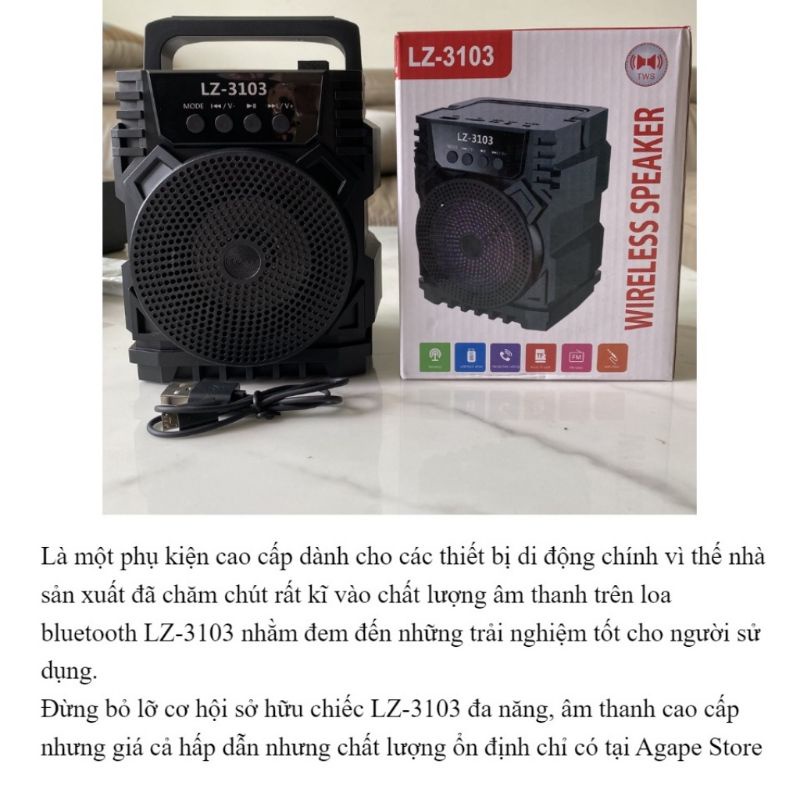 Loa nghe nhạc bluetooth Lz-3103 Loa bluetooth min đèn LED nhấp nháy âm thanh siêu hay hỗ trợ cắm thẻ nhớ- Loa nghe nhạc bluetooth Lz-3103 trang bị công nghệ bluetooth vô cùng phổ biến nên bạn có thể kết nối loa với các thiết bị công nghệ thông minh như điện thoại, máy tính bảng, laptop đấy nhé. Sử dụng bluetooth ở loa cũng rất đơn giản, chỉ cần mở nguồn là loa sẽ tự động mở kết nối , sau đó kết nối của điện thoại bạn với loa là có thể nghe nhạc, xem phim, gọi điện trò chuyện thông qua loa cực kì thoải mái thoải mái.