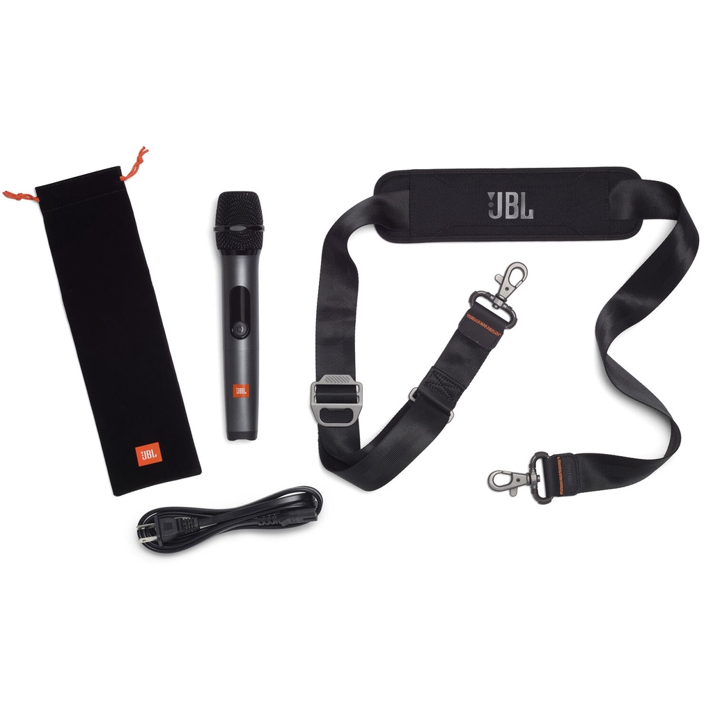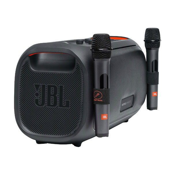 - JBL PartyBox On-The-Go có trang bị đi kèm là hai micrô không dây JBL với phạm vi lên đến 10 mét. Thiết kế nhiều jack cắm để gắn thêm một mic có dây hoặc nhạc cụ bạn muốn chơi.