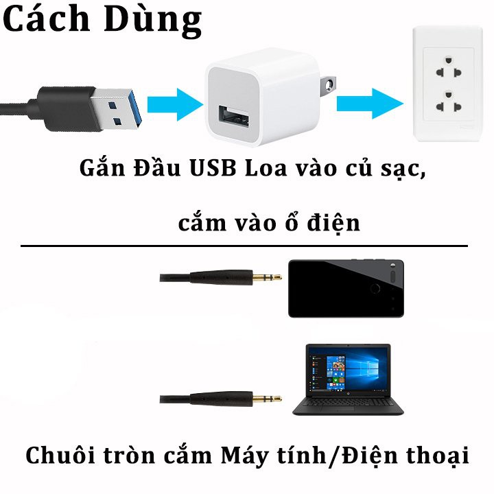 - Có thể cấp điện cho loa qua nhiều cách khác nhau: cốc sạc điện thoại, pin dự phòng, laptop, PC,..