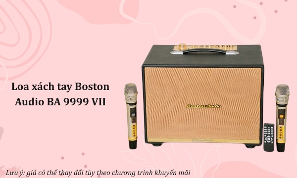 Loa xách tay Boston Audio BA 9999 VII thiết kế nhỏ gọn Công suất lớn lên đến 550W cho âm thanh chất lượng cao Trang bị 02 cây micro cao cấp giúp chống hú, chống rớt Cho phép kết nối đa dạng: Bluetooth, USB, SD Card Gồm 1 bass 8 inch và 2 treble, có quai xách tiện lợi