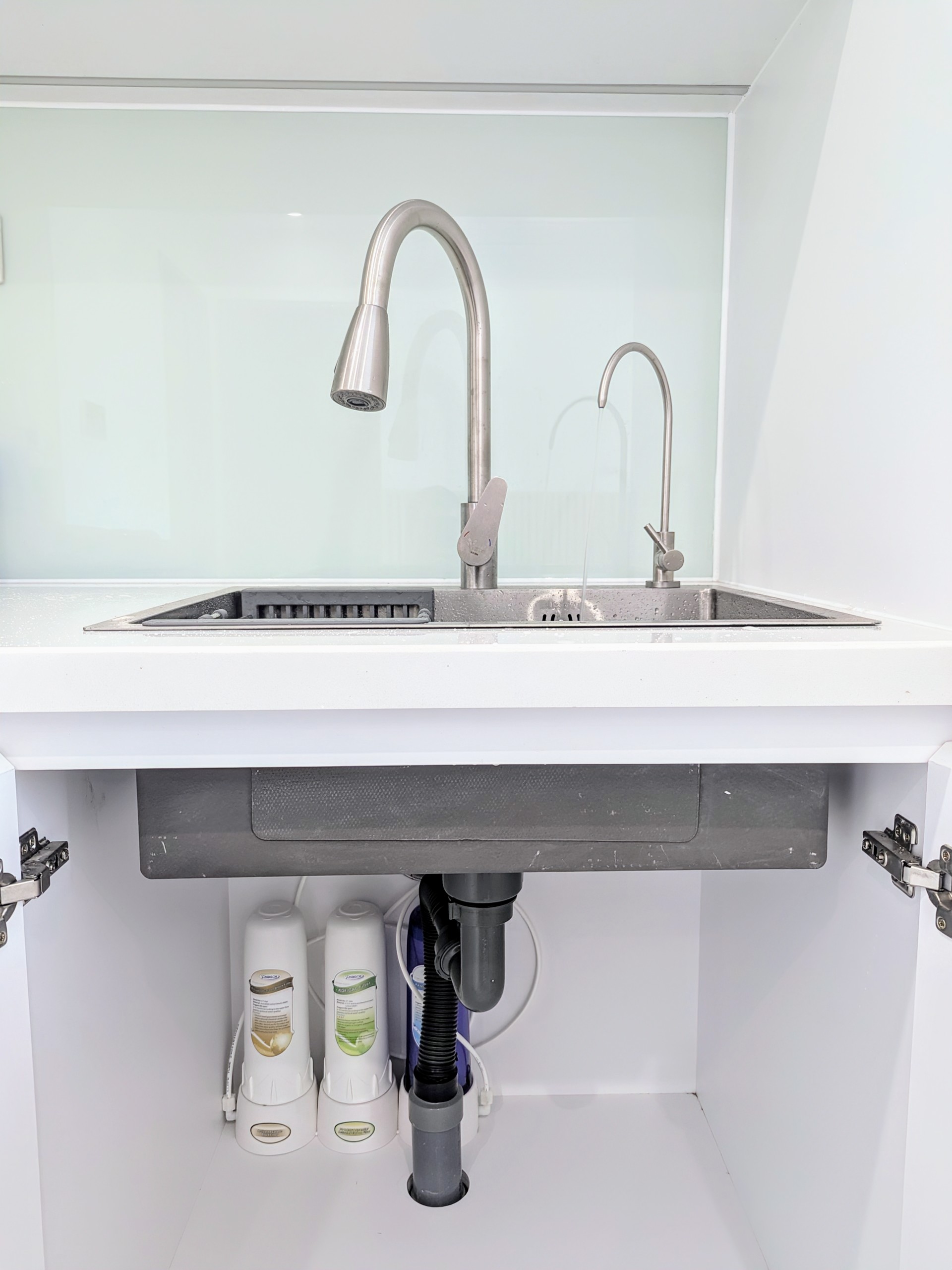 Bộ lọc có thể lắp liền với vòi trên bàn hoặc bộ lọc lắp âm dưới bàn với vòi inox 304 trên bàn.