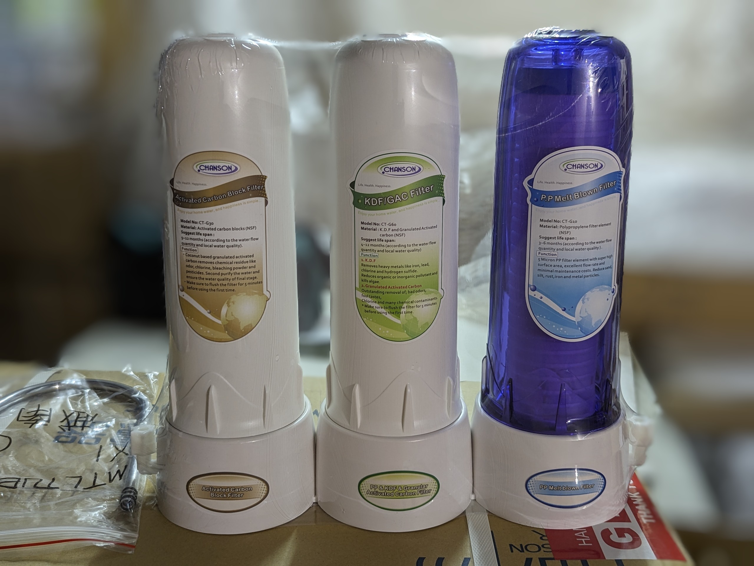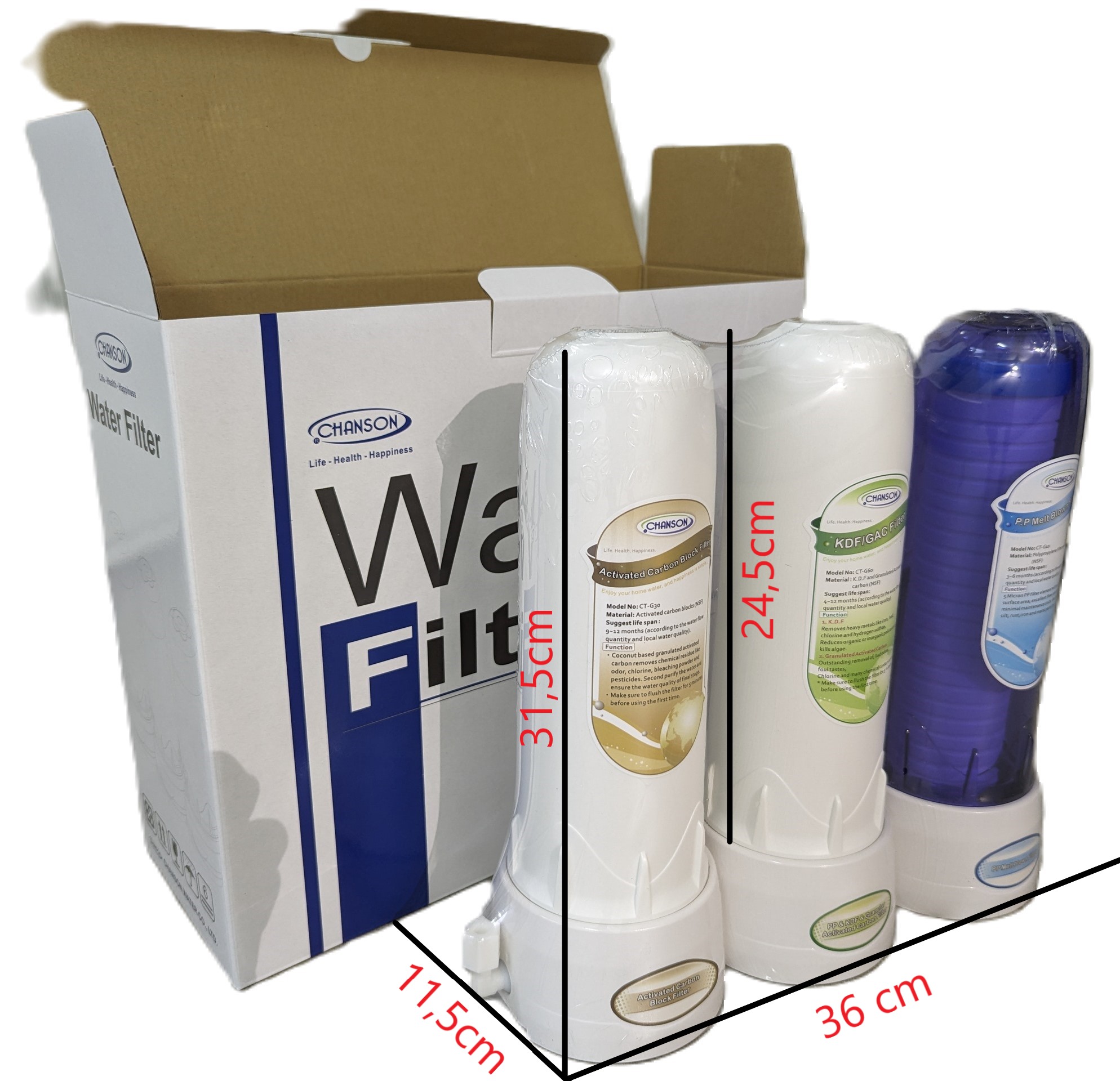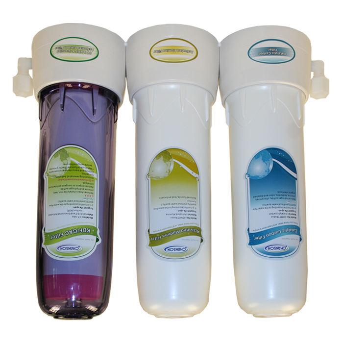 Phụ kiện đi kèm | Bộ lọc SF, cũng là bộ lọc C3 của Chanson bán ở Mỹ và các nước châu Âu, loại bỏ các tạp chất độc hại trong nước như chloramines, chì, arsenic, sulfur, thuốc trừ sâu có thể gây các loại bệnh hoặc vấn đề về sức khỏe liên quan đến đường ruột và tiêu hóa về lâu dài. Bộ lọc vẫn giữ các đặc tính hữu ích của nước, giữ lại khoáng chất cần thiết cho sức khỏe (Trong khi lọc RO loại bỏ hoàn toàn khoáng chất cần thiết và còn thải ra rất nhiều nước). Nước uống trực tiếp tại vòi, không cần bình chứa (như lọc RO).Bộ lọc có thể lắp liền với vòi trên bàn hoặc bộ lọc lắp âm dưới bàn với vòi inox 304 trên bàn.Hình 1: Bộ lọc 3 cấp lắp trên bàn Hình 2: Vòi nước inox 304 để lắp SF âm bàn[I] Bộ lọc SF có 3 cấp lọc với các ruột lọc như sau:Bộ lọc thiết kế chắc chắn, ruột lọc 10-inch lắp bằng ren vặn chắc chắn, tránh rò rỉ nước bẩn qua khe lắp.CT-G10: bằng sợi polypropylene (PP) đạt chuẩn NSF, diện tích bề mặt hấp thụ lớn, 5 micron, loại bỏ các tạp chất kích thước lớn như cát, đất bùn, gỉ sét, kim loại, ….Tuổi thọ: 3 – 6 tháng, tùy lượng nước dùng hoặc chất lượng nước đầu vào.CT-G60: (NSF) kết hợp 2 lớp KDF / hạt than hoạt tính.KDF có tác dụng loại bỏ kim loại nặng như chì, sắt, clo, H2S, giảm các tạp chất vô cơ và hữu cơ, diệt tảo, gốc tự do.Hạt than hoạt tính loại bỏ mùi vị khó chịu trong nước, clo, chloramine và nhiều hóa chất khác.Tuổi thọ: 4 – 12 tháng, tùy lượng nước dùng hoặc chất lượng nước đầu vào.CT-G70 (thay CT-G60 để dùng cho nước cứng): (NSF) Các hạt trao đổi ion (resin beads) có ưu thế vượt trội trong việc loại bỏ ion Magiê, cặn Ca, …. Chuyển nước cứng thành nước mềm. Tuổi thọ: 800 lít, tùy lượng nước dùng hoặc chất lượng nước đầu vào. Tái sinh được 3 lần nữa bằng dung dịch muối ăn.CT-G30: Than hoạt tính dạng hạt (đạt chuẩn NSF) tăng khả năng hấp thụ các tạp chất kích thước siêu mịn, loại bỏ tàn dư hóa chất, mùi, vị tạp chất, chất tẩy, thuốc trừ sâu, …Tuổi thọ: 9 - 12 tháng, tùy lượng nước dùng hoặc chất lượng nước đầu vào.[II] Thông số kỹ thuật:Kích thước: Cao 30.5 cm (Ruột lọc 10 inch) x Rộng 32 cm x Sâu 10 cmĐiện và nước thải: không cóÁp suất nước: 5 – 90 psi (0.35 – 6 kgf/cm2)Lưu lượng: tùy thuộc áp suất nguồn nướcTuổi thọ ruột lọc: Theo khuyến cáo trên sản phẩm của Chanson, tùy điều kiện nào tới trước; Có thể dùng tối đa 8000 lít, trong thời gian không quá 12 tháng.Bảo hành: 5 năm (không bao gồm ruột lọc) |