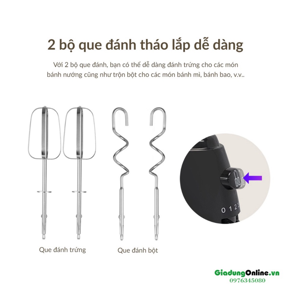 - Cấu tạo tay cầm chắc chắn, chống trơn trượt, dễ dàng sử dụng. Và còn được trang bị 2 bộ que đánh, bạn có thể dễ dàng đánh trứng cho các món bánh nướng cũng như trộn bột cho các món bánh mì, bánh bao, bánh bông lan...
