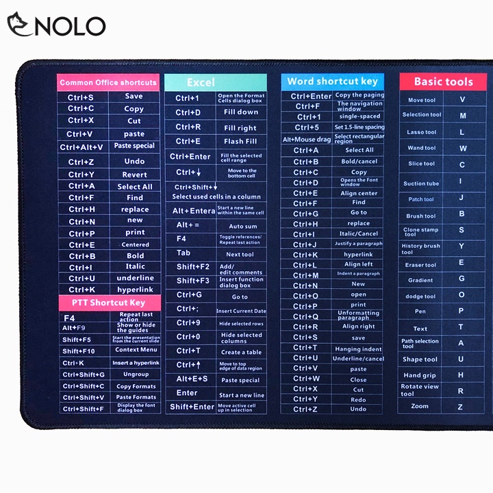 Lót Chuột Padmouse Lớn Kích Thước 30x80cm Dày 3 Ly Bề Mặt In 3D Không Phai 175 Phím Tắt Lệnh Của Office, Word, Photoshop