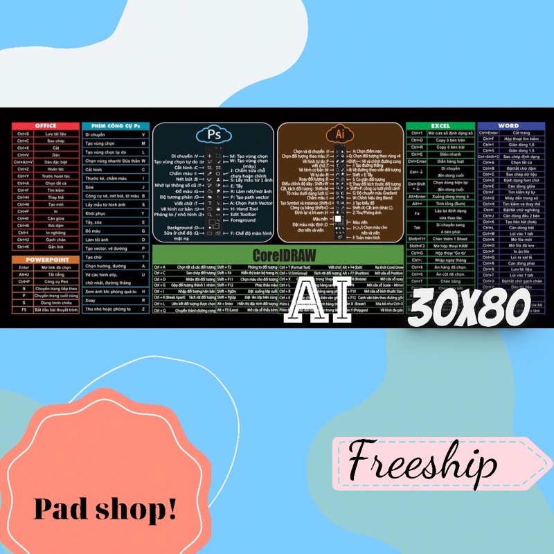 Giới thiệu lót chuột phím tắt văn phòng thiết kế office window Ai Ps bản tiếng việt đủ size