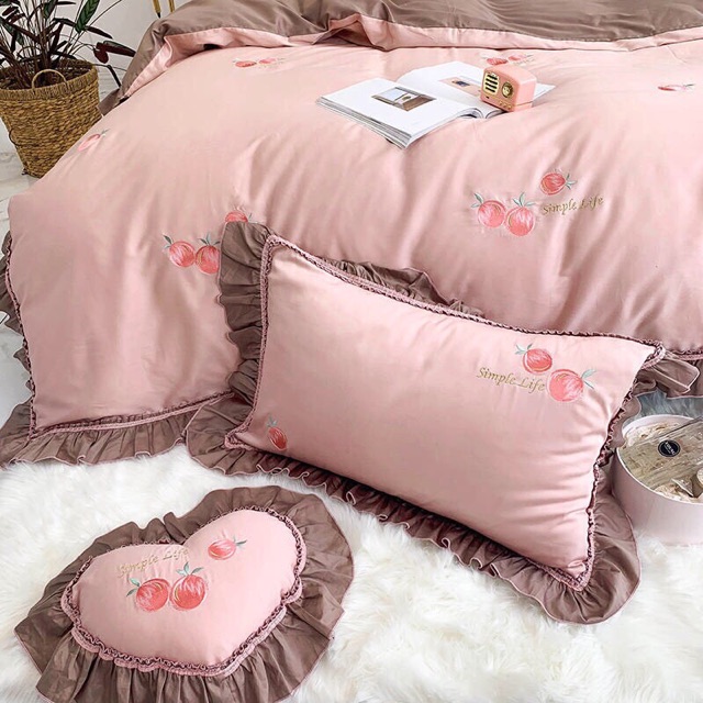Giới thiệu Bộ lụa cao cấp 60s gồm 6 món màu hồng phấn có gối tim