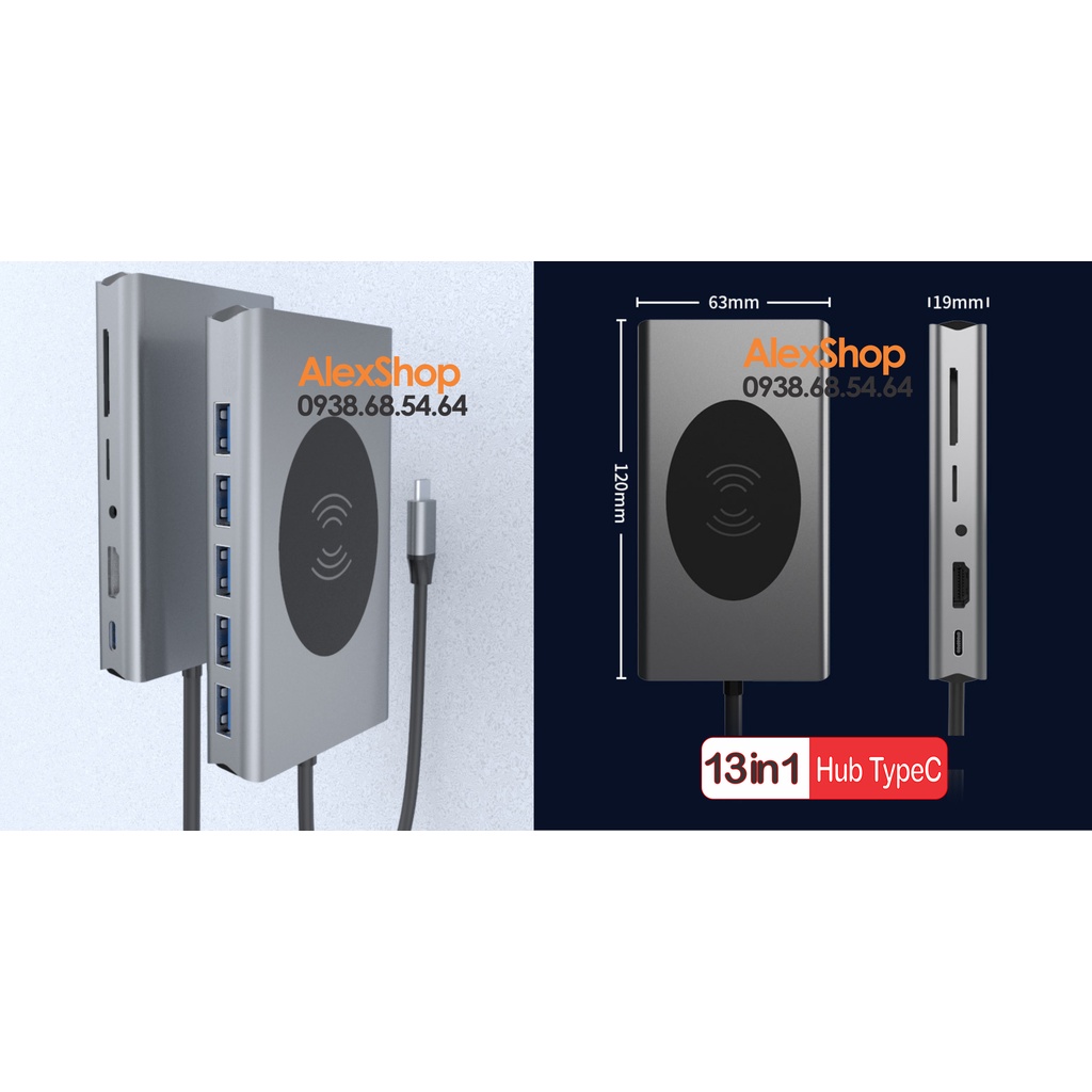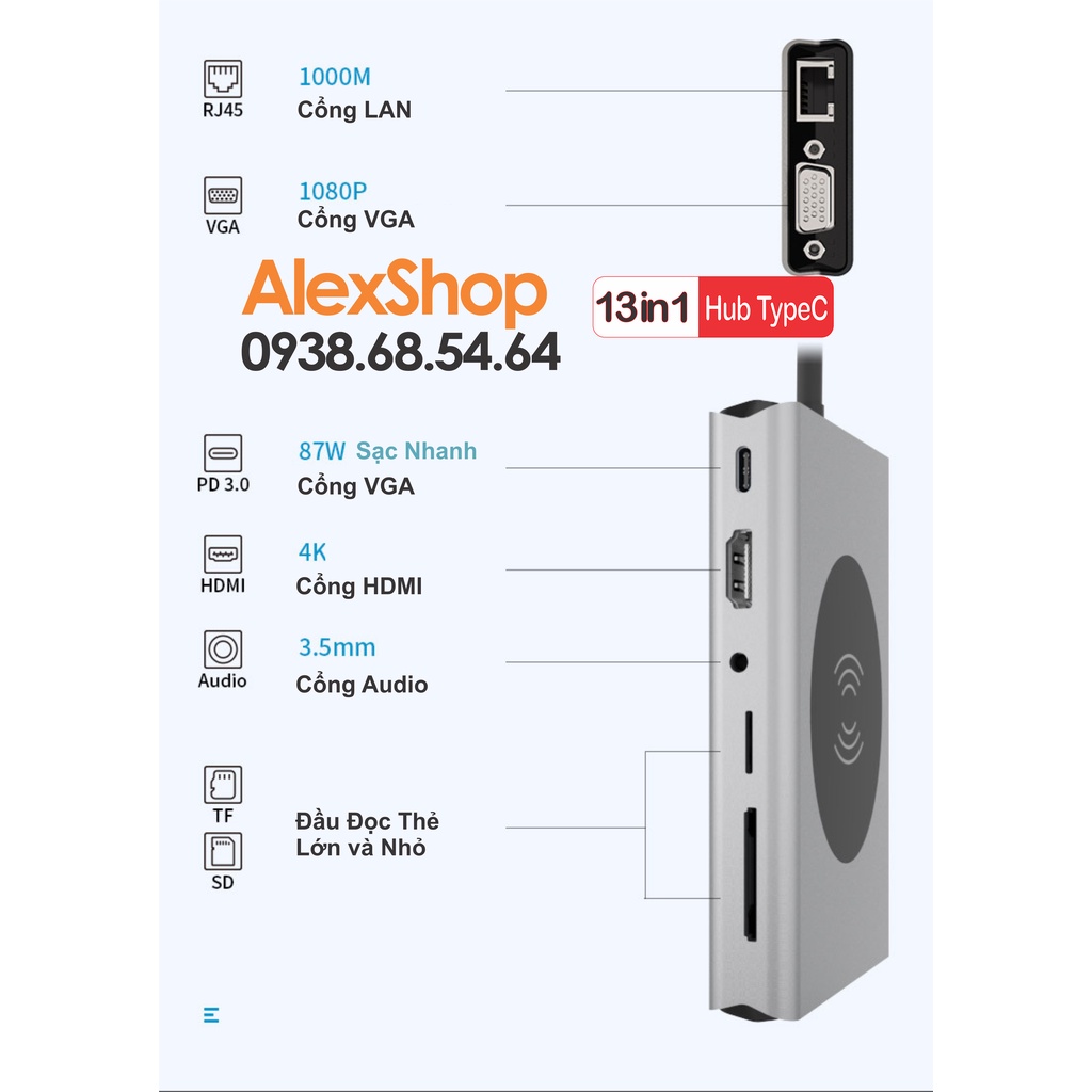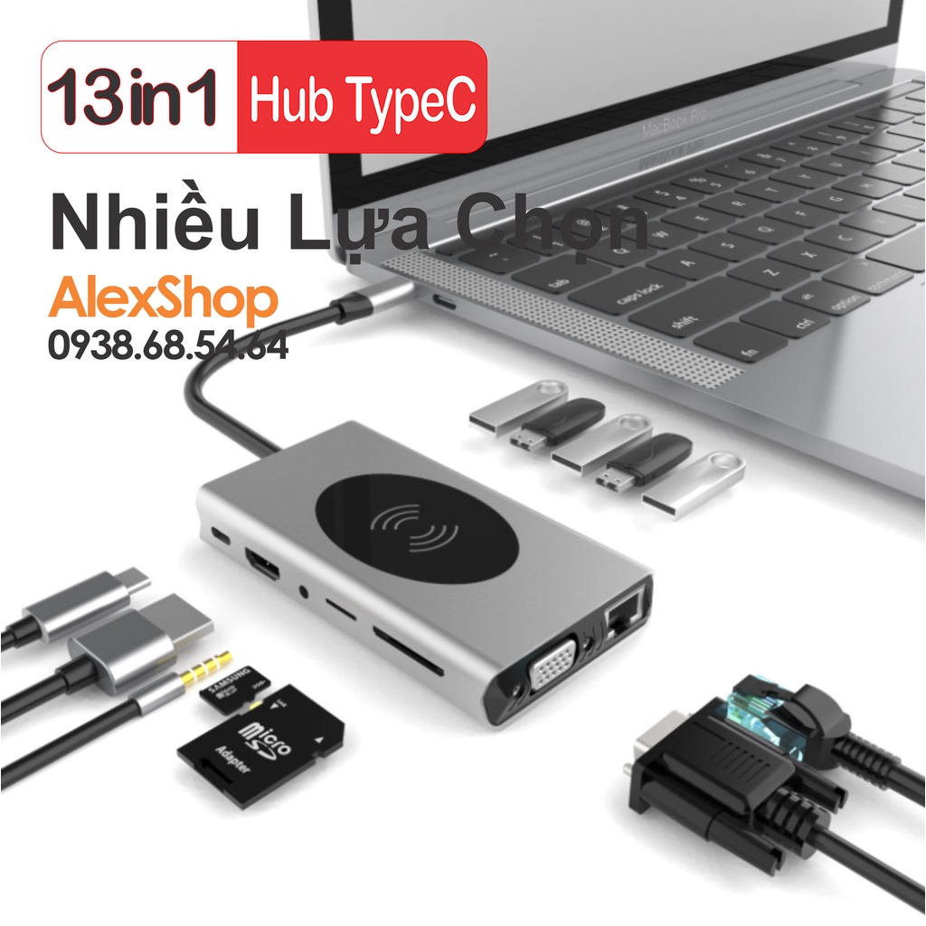 ⚡ Hub 13 trong 1: Cổng TypeC 60W vừa sạc nhanh 3.0 vừa truyền dữ liệu typec 2.0; 3 USB 3.0 và 2 USB 2.0; Đọc Thẻ nhớ TF/SD; HDMI 4K; Cổng Audio 3.5; VGA; Cổng LAN RJ45; Sạc Không Dây