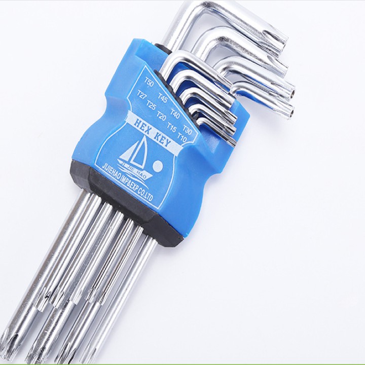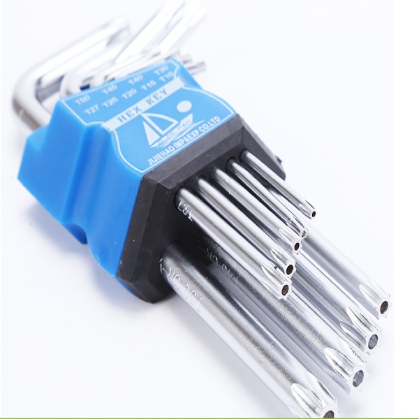 Và chúng tôi xin giới thiệu với bạn bộ lục giác 9 cây đầu bông mai với kích thước từ T9 đến T40. Bộ lục giác này được chế tạo bằng thép S2, là loại thép chuyên dùng để chế tạo lục giác, vì có độ bền cao, chịu lực tốt.