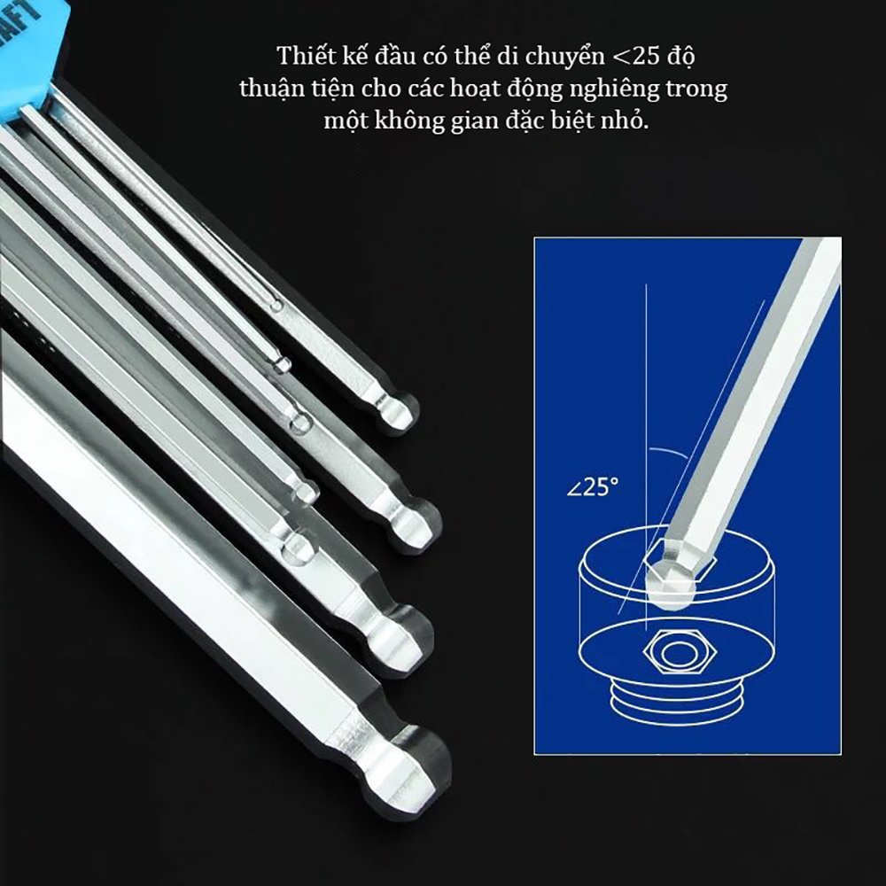 9 chi tiết:1.5mm,2mm,2.5mm,3mm,4mm,5mm,6mm,8mm,10mm phù hợp với hầu hết mọi loại ốc lục giác thông dụng